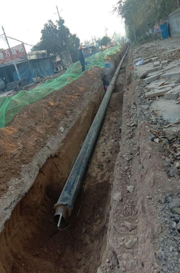 為了能夠讓電廠家屬院能夠在供暖季正常用暖,公司對(duì)該項(xiàng)目工地實(shí)行分段施工,分班次、加班加點(diǎn)搶工期。10月上旬完成了電廠北門溝槽的開挖工作,10月16日起,開始向溝槽下放熱力管道。