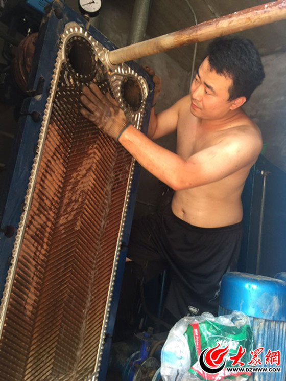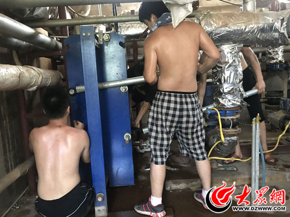下午4時左右,大眾網(wǎng)記者來到位于丹陽路上的國稅局家屬院。家屬院角落處的供熱設(shè)備機房內(nèi)悶熱狹小,空氣流通不暢,大眾網(wǎng)記者剛進去一小會就已經(jīng)汗流浹背。正在清洗換熱器的供暖管理員們有的光著膀子作業(yè),身上水光锃亮,有的脖子上掛著毛巾,但沒過幾分鐘剛在水管洗凈擰干的毛巾又已經(jīng)滿是汗水。