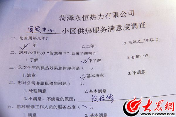 大眾網(wǎng)記者在現(xiàn)場看到,永恒熱力工作人員還向市民發(fā)放一張小區(qū)供熱服務(wù)滿意度調(diào)查表,調(diào)查表上,市民可對(duì)供熱效果、客服保修、維修工作人員的服務(wù)態(tài)度等事項(xiàng)進(jìn)行評(píng)價(jià),各小區(qū)的供熱服務(wù)質(zhì)量也由此直接呈現(xiàn)出來。菏澤永恒熱力相關(guān)負(fù)責(zé)人介紹,他們將根據(jù)調(diào)查結(jié)果,改進(jìn)供熱服務(wù)方式,持續(xù)提高服務(wù)質(zhì)量。