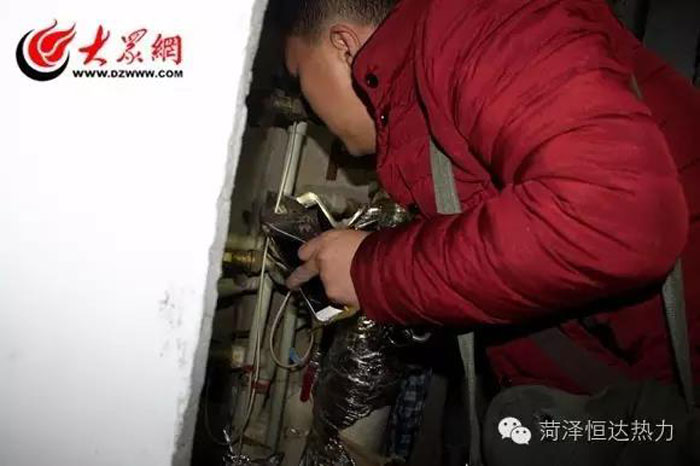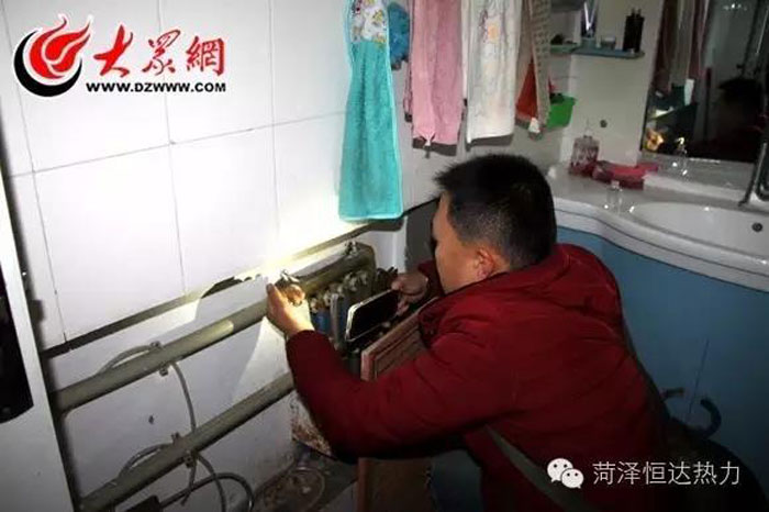 劉明賢在C棟居民家里檢測供熱設(shè)備,空間狹小,劉明賢用手機(jī)閃光燈照明