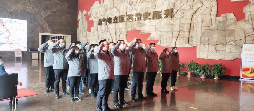 在菏澤冀魯豫邊區(qū)革命紀(jì)念館序廳內(nèi),由支部書記肖培飛同志領(lǐng)誓,全體黨員整齊列隊,鄭重舉起右手,集體重溫入黨誓詞。