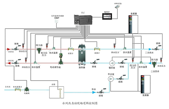 2.4.1熱力站控制系統(tǒng)應(yīng)由可編程控制器、觸摸屏、變頻器、監(jiān)測(cè)儀表、電動(dòng)調(diào)節(jié)閥、現(xiàn)場(chǎng)總線組成,完成數(shù)據(jù)采集、就地顯示、自動(dòng)控制、參數(shù)存儲(chǔ)、實(shí)時(shí)通訊、故障報(bào)警等功能。近熱源(根據(jù)設(shè)計(jì),資用壓頭富裕的熱力站)高溫水網(wǎng)熱力站須加裝自力式差壓控制器;