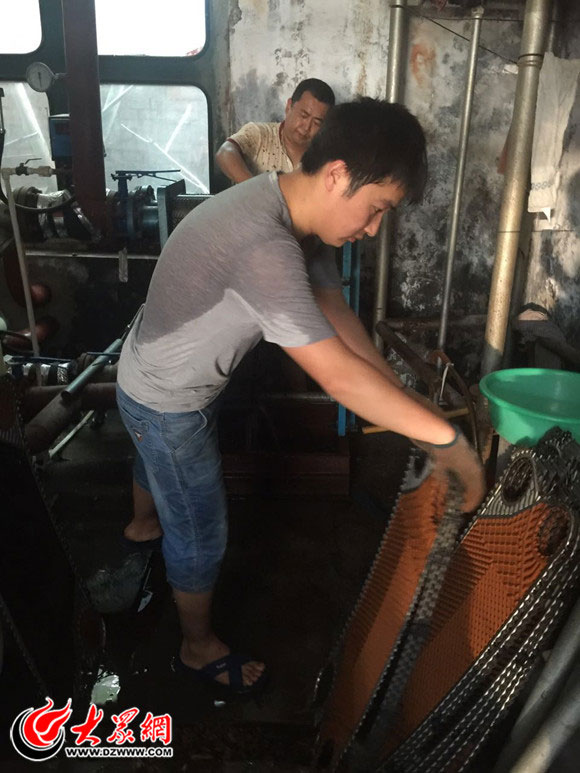 下午4時左右,大眾網(wǎng)記者來到位于丹陽路上的國稅局家屬院。家屬院角落處的供熱設(shè)備機房內(nèi)悶熱狹小,空氣流通不暢,大眾網(wǎng)記者剛進去一小會就已經(jīng)汗流浹背。正在清洗換熱器的供暖管理員們有的光著膀子作業(yè),身上水光锃亮,有的脖子上掛著毛巾,但沒過幾分鐘剛在水管洗凈擰干的毛巾又已經(jīng)滿是汗水。