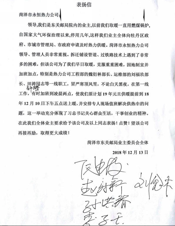 12月13日,永恒熱力辦公室收到了來自雙河路郵政局家屬院業(yè)主委員會的表揚信。感謝永恒熱力工程部和運行管理五部盡心盡力為其解決供暖問題。