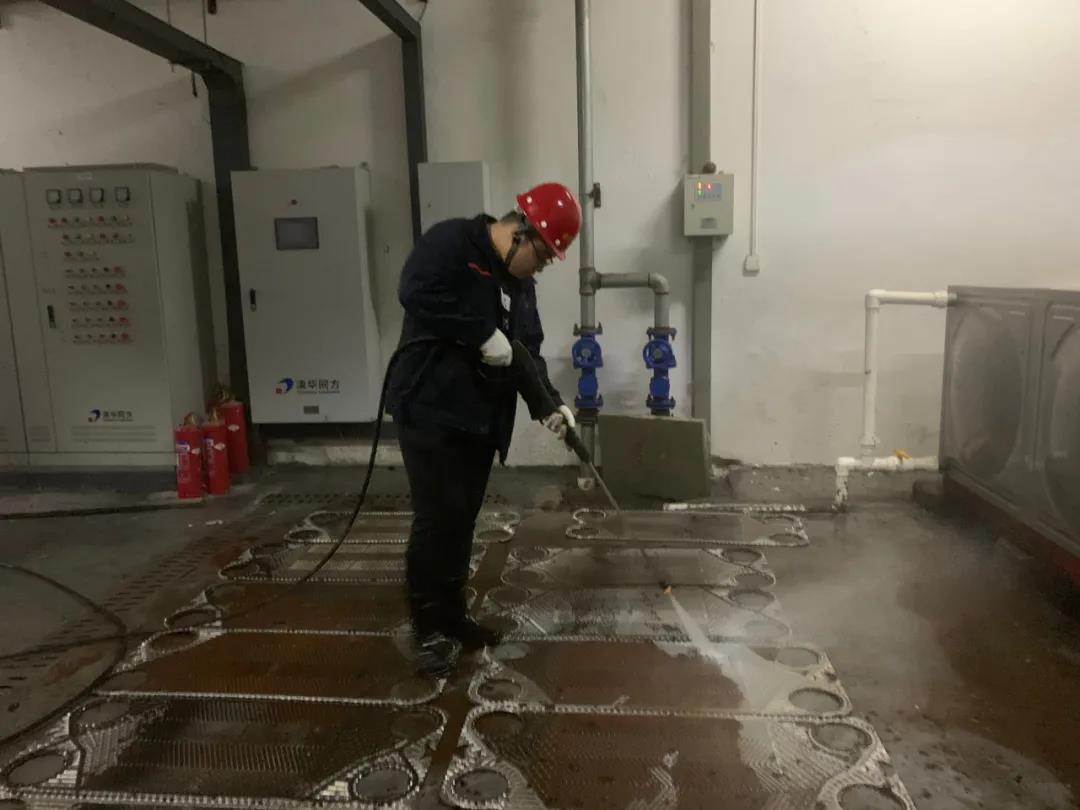 換熱站大多位于地下,空間狹小、十分悶熱,再有高壓水槍“加持”,整個(gè)換熱站內(nèi)霧氣蒙蒙,猶如“仙境”。幾個(gè)動(dòng)作下來(lái),運(yùn)營(yíng)管理四部全體人員已是汗流如注。大家踩著濕漉漉的地面,動(dòng)作一刻不停歇,換熱站內(nèi)水花四濺,現(xiàn)場(chǎng)人員熱火朝天。